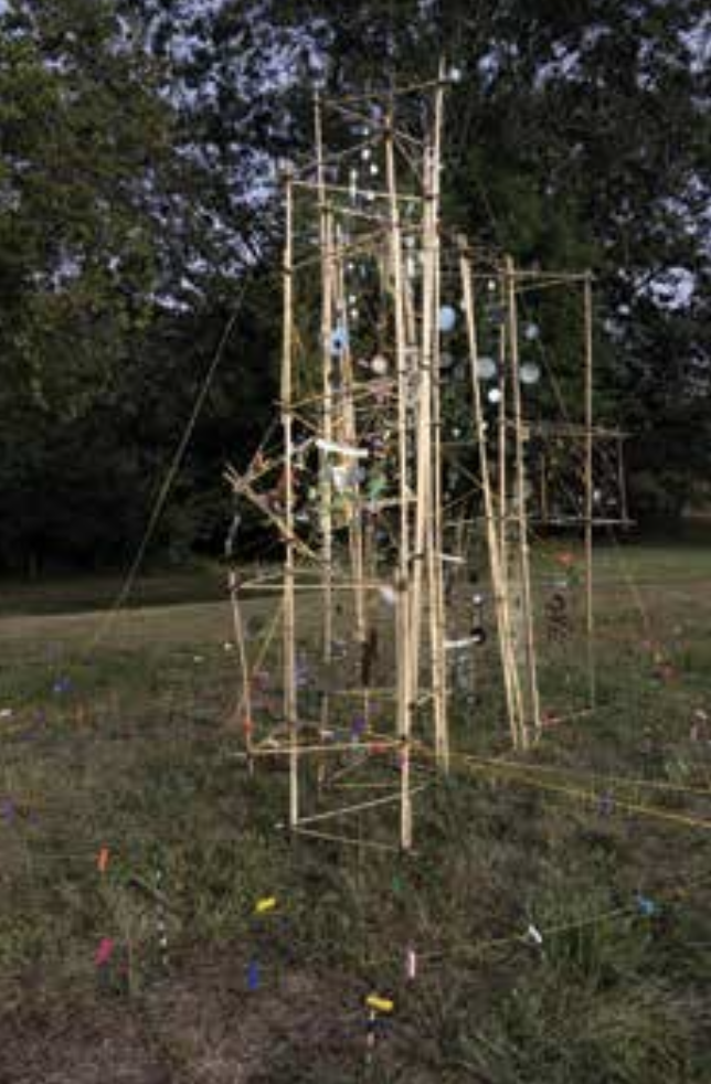 bamboo stakes, fishing line, gold threads, mirrors, metal pieces, zip ties