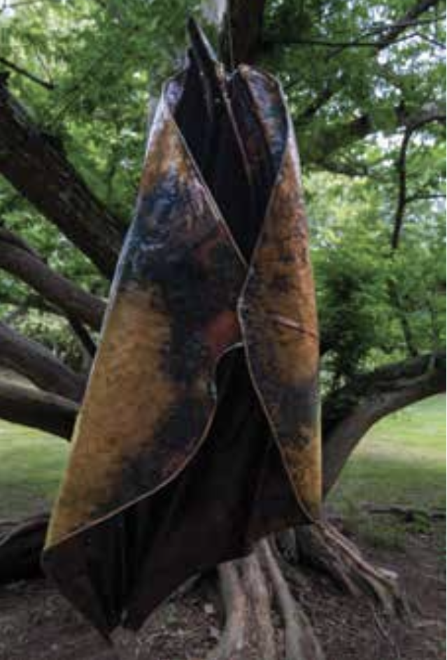 “Hanging by...” was inspired by the forms of the big cedars at Maudslay. It was hand-formed from reclaimed copper.